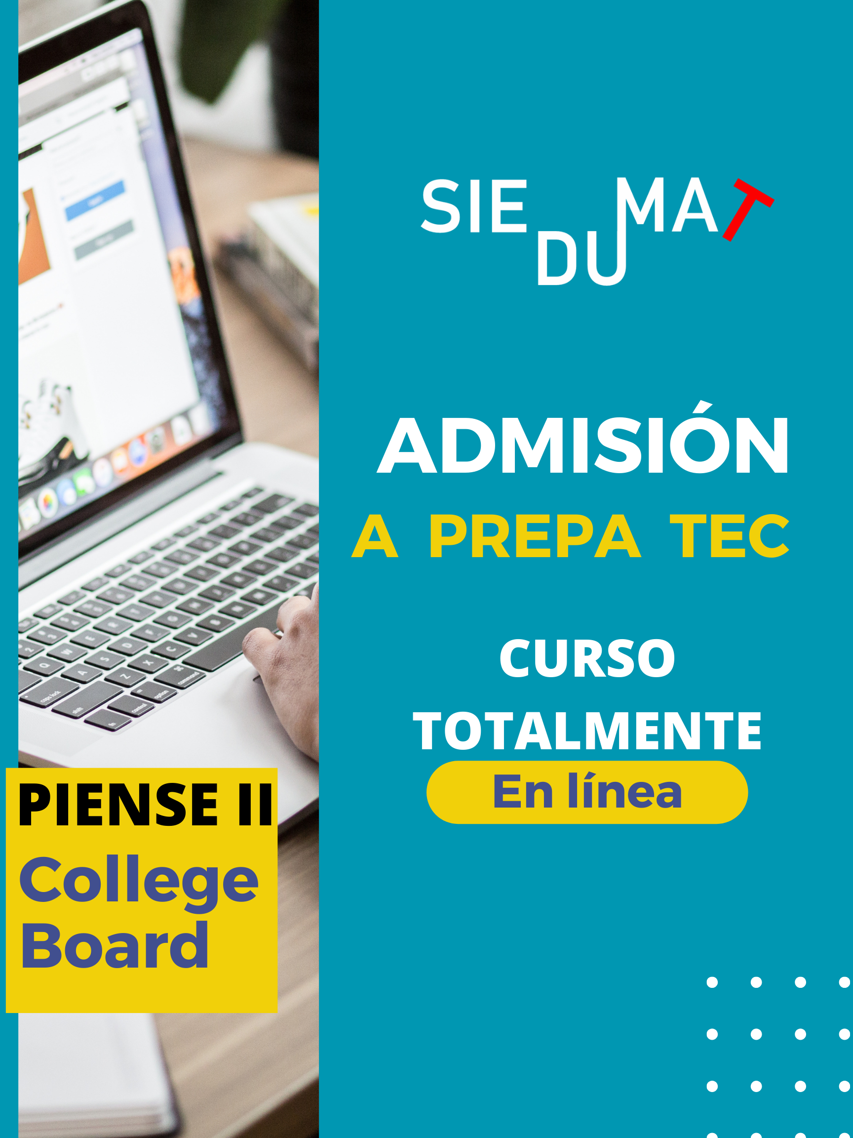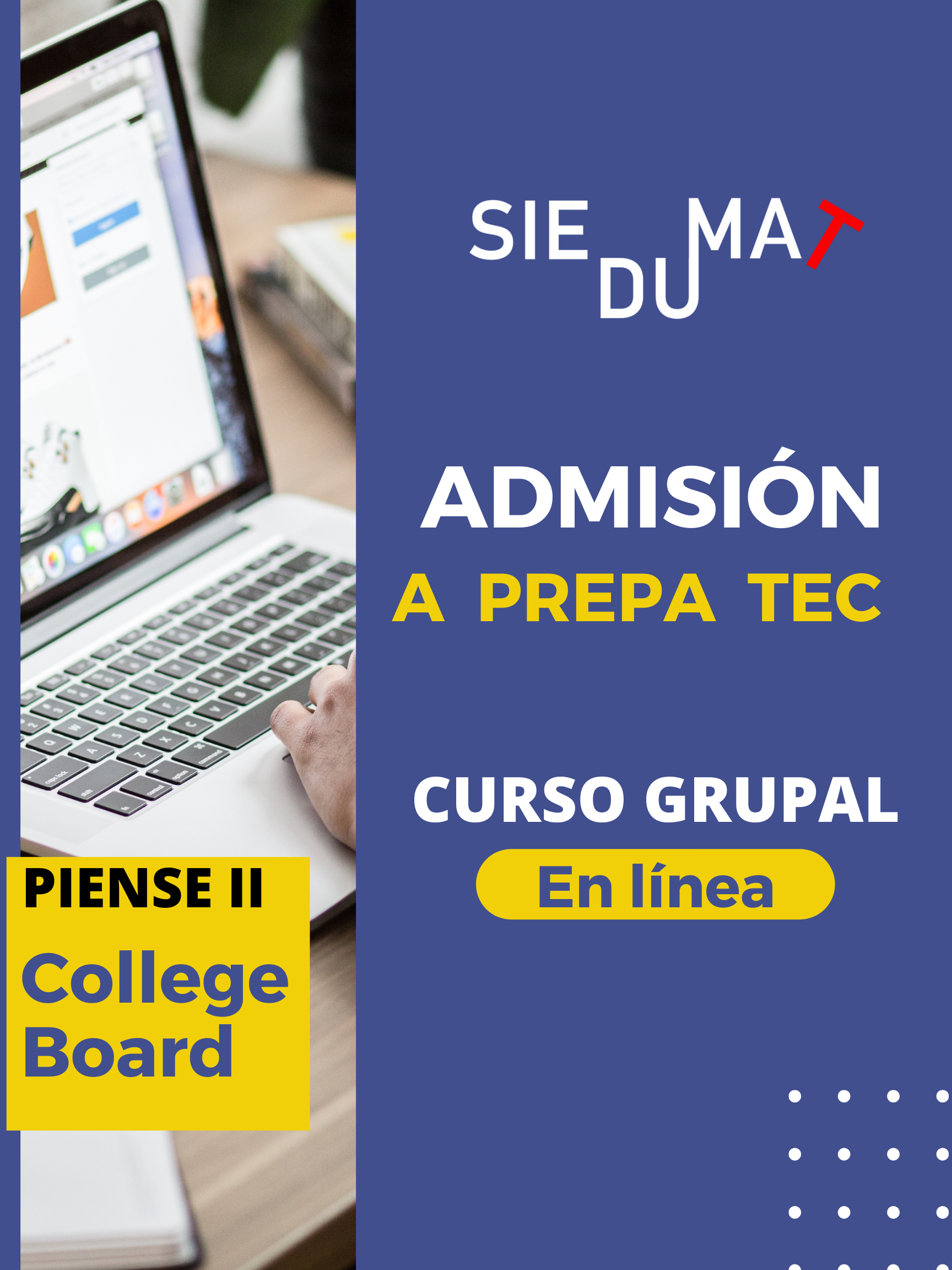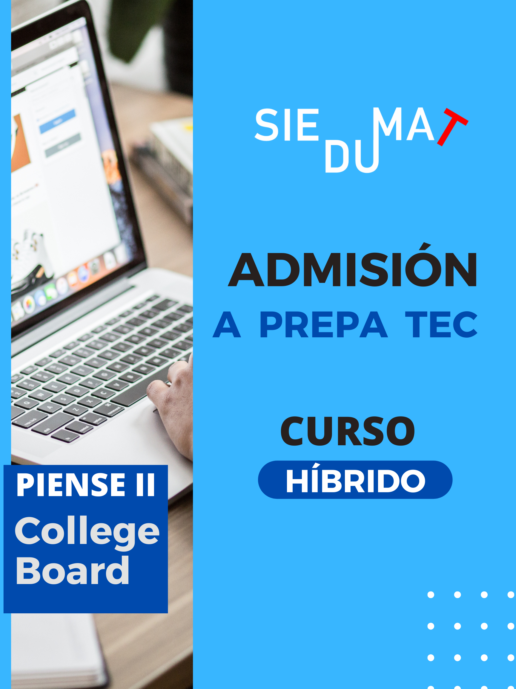 El examen que aplica el Tec de Monterrey para admisión a Prepa Tec es la Prueba de Ingreso y Evaluación para el Nivel Secundario (PIENSE II) del College Board, la cual evalúa Matemáticas, Español, Habilidad Cognoscitiva e Inglés. Nuestro curso contempla las 3 primeas áreas, el apartado de Inglés es opcional.